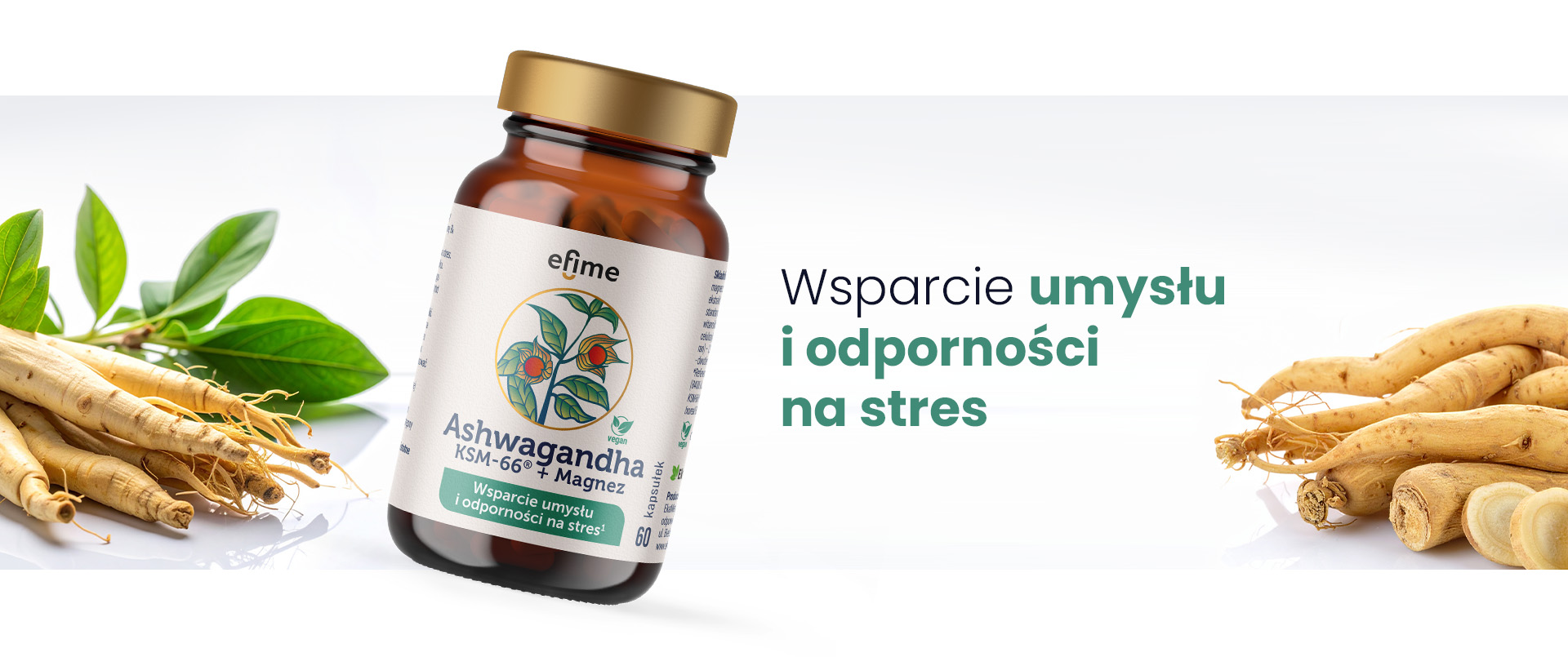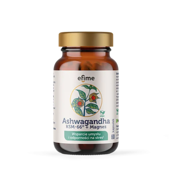 Ashwagandha - suplement diety w kapsułkach zawierający ekstrakt z korzenia witanii ospałej – ashwagandha, witaminę B6 oraz magnez. Ekstrakt z witanii ospałej - ashwagandha posiada właściwości adaptogenne.