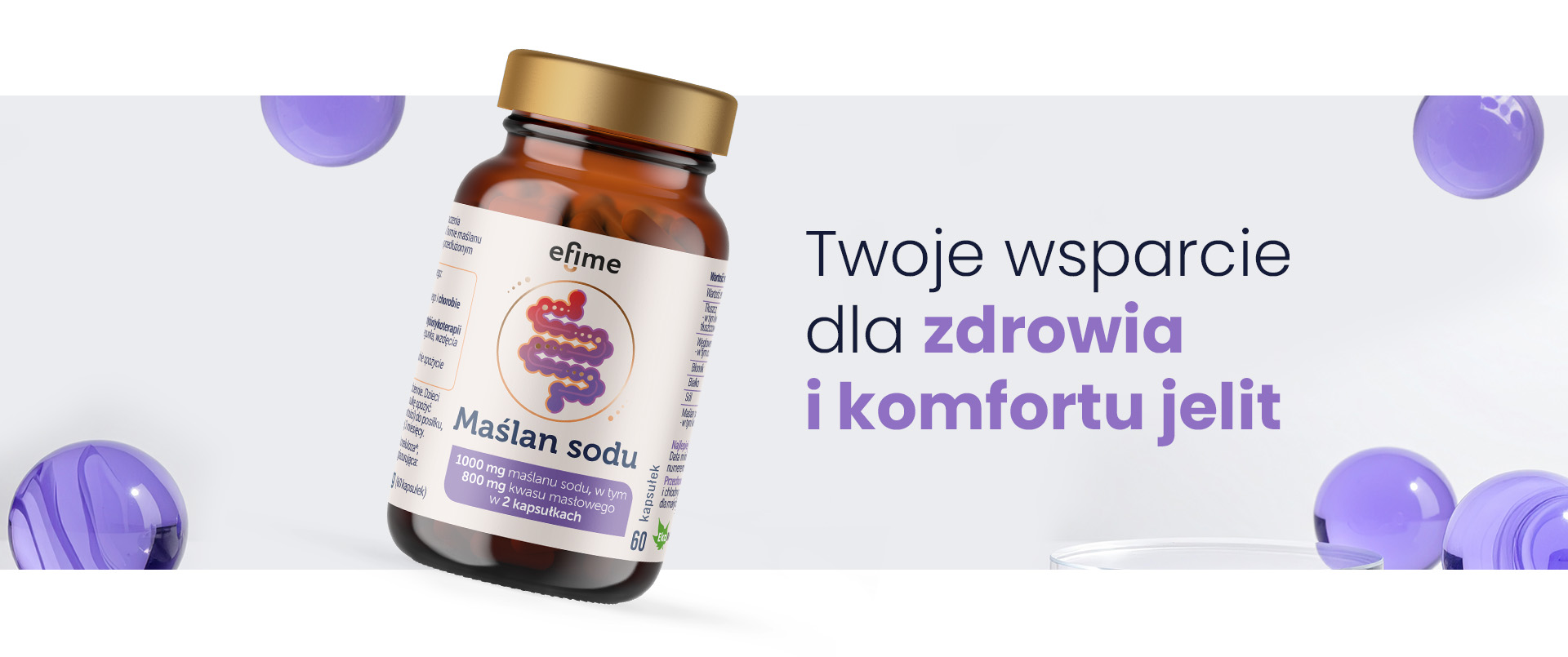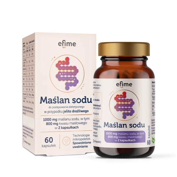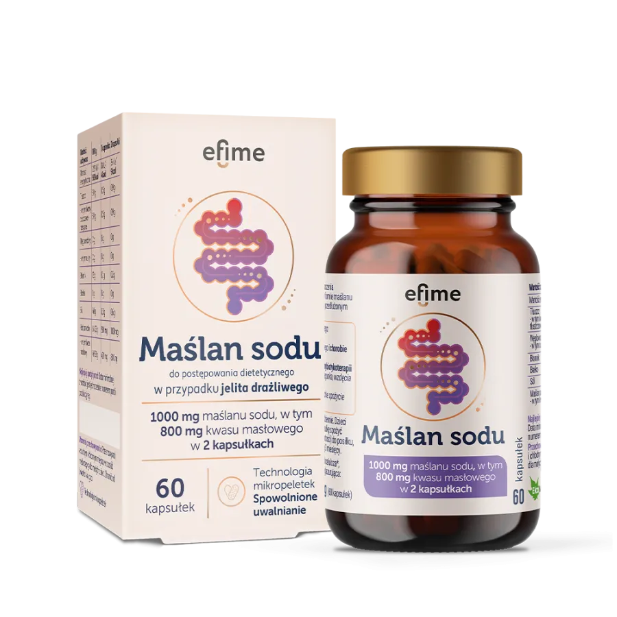 efime Maślan sodu to żywność specjalnego przeznaczenia medycznego zawierająca kwas masłowy w postaci maślanu sodu w kapsułkach z mikropeletkami Sustained Release (SR*).